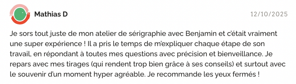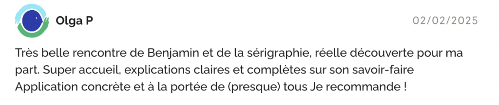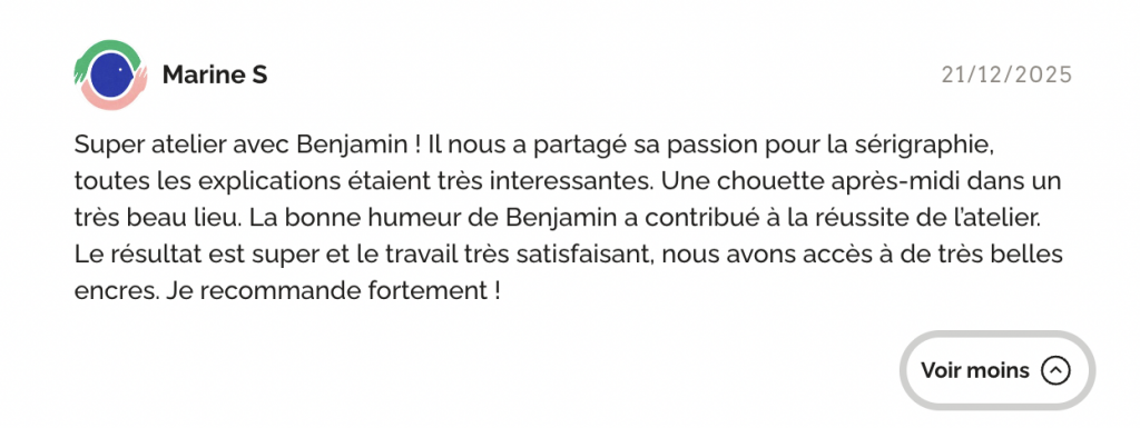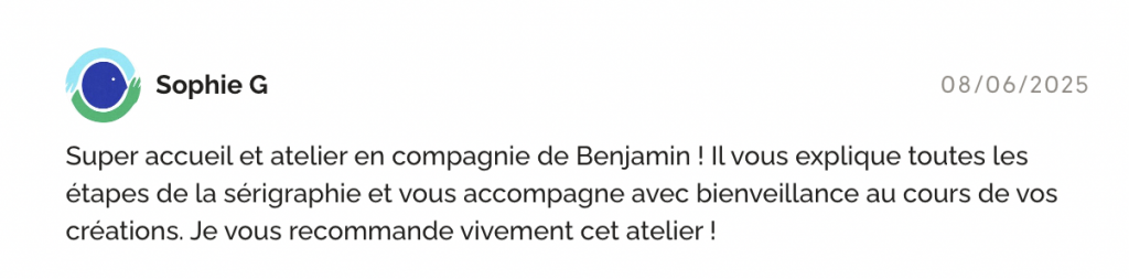Tout au long de l’atelier, l’accompagnement est personnalisé pour vous permettre de comprendre les principes essentiels de la sérigraphie et de gagner en autonomie.